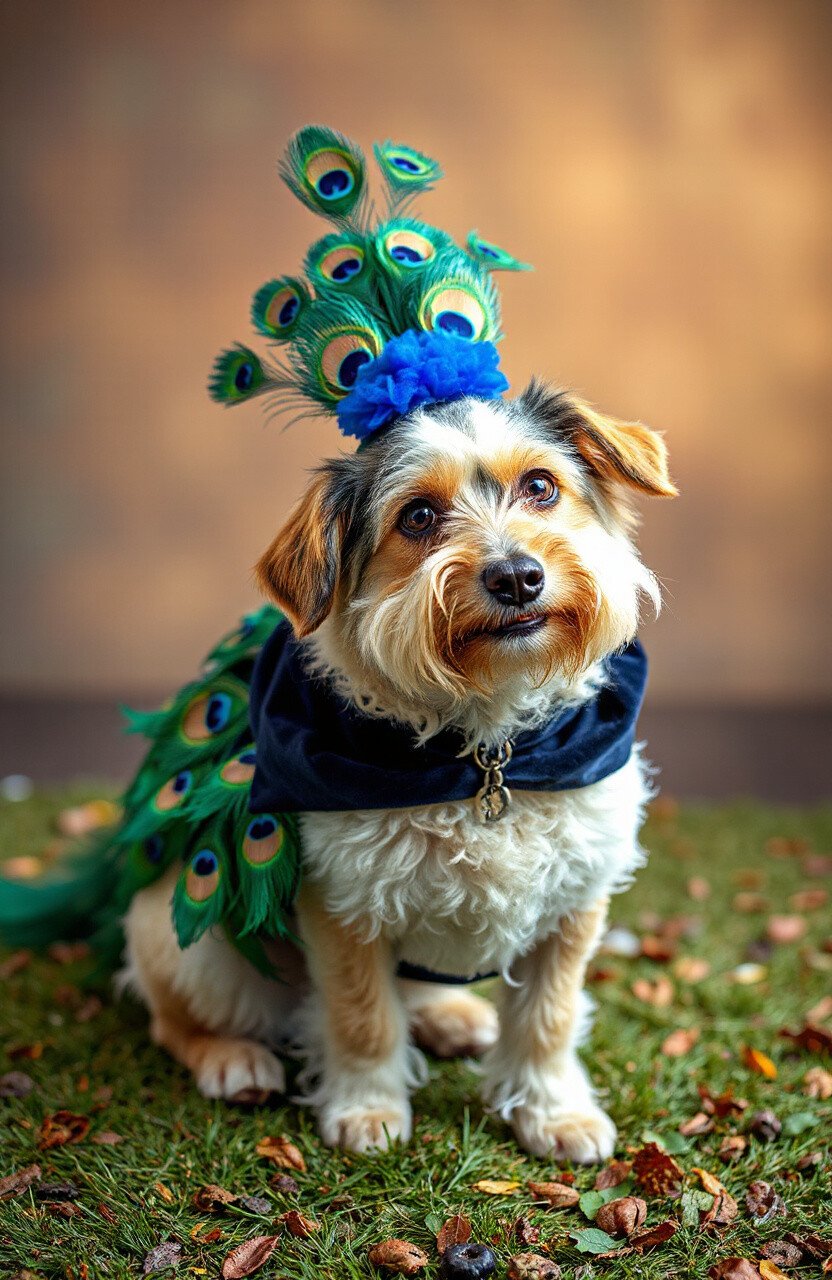 Your dog will be the most dazzling one at the party with a peacock costume. Colorful feathers and a tail make this outfit stand out.