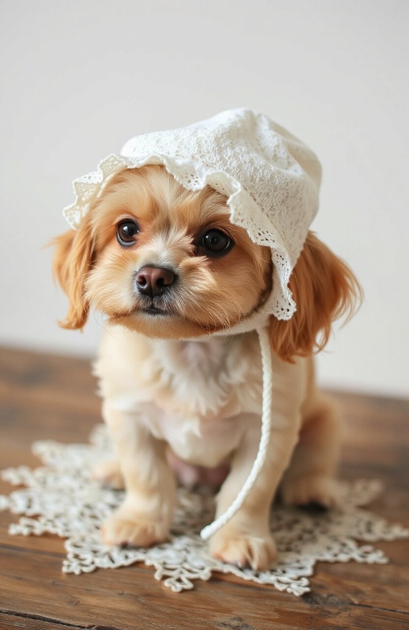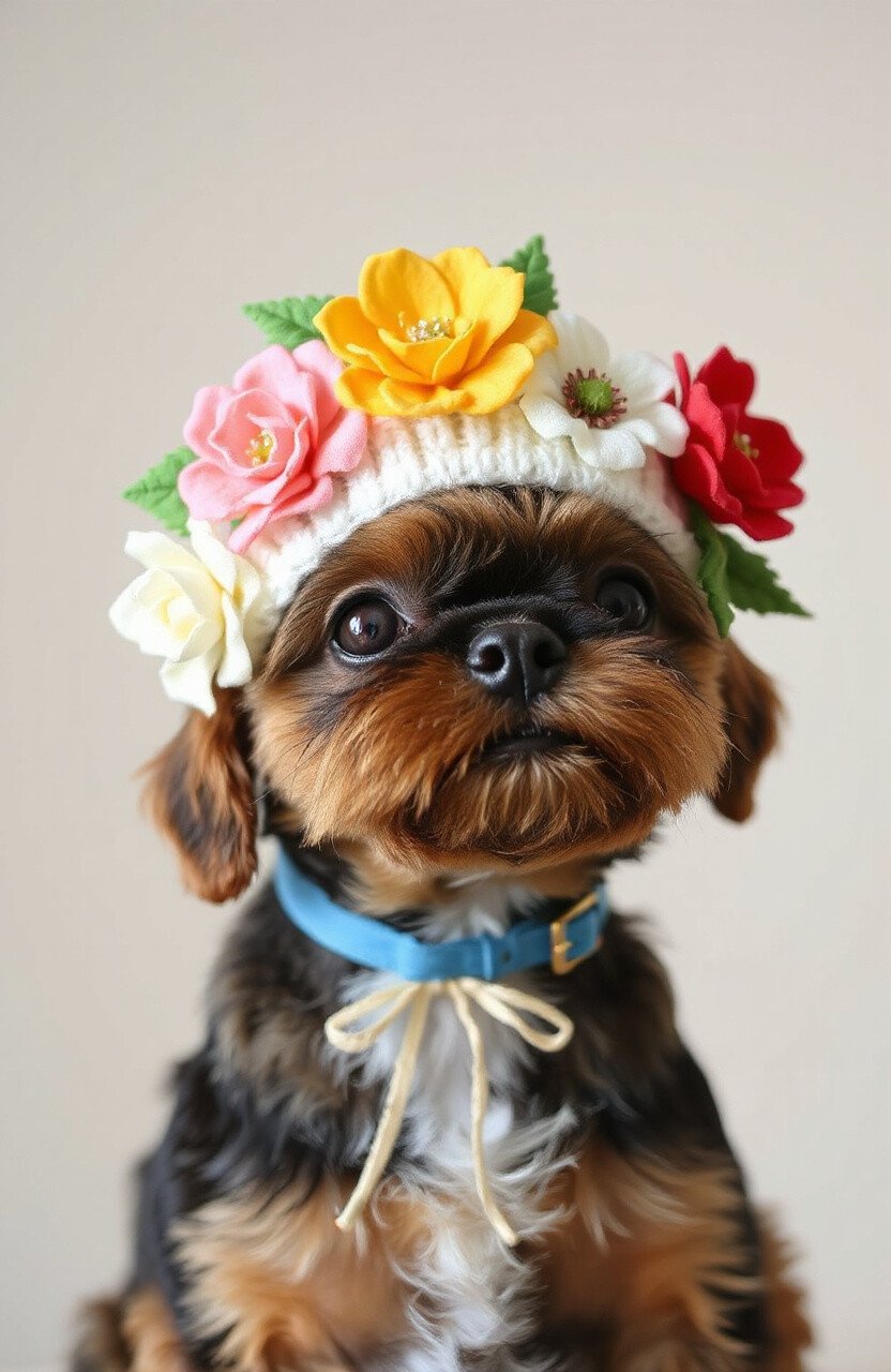 Attach fabric flowers to your pet’s beanie for a sweet and romantic look. Choose colors that complement your pet’s fur.