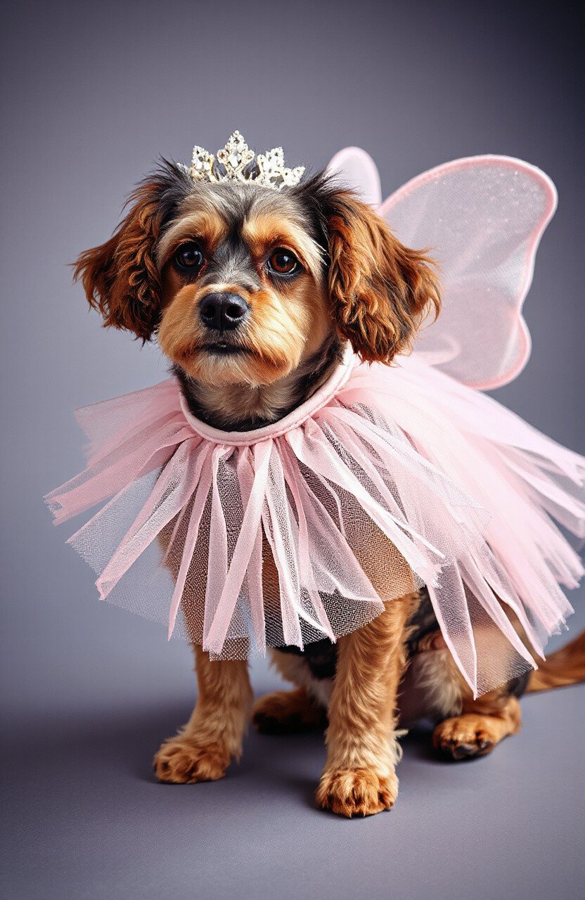 Pair it with fairy wings for extra magic. These capes are often available in costume sections and are reasonably priced. It’s a fairy tale come true for your furry friend!