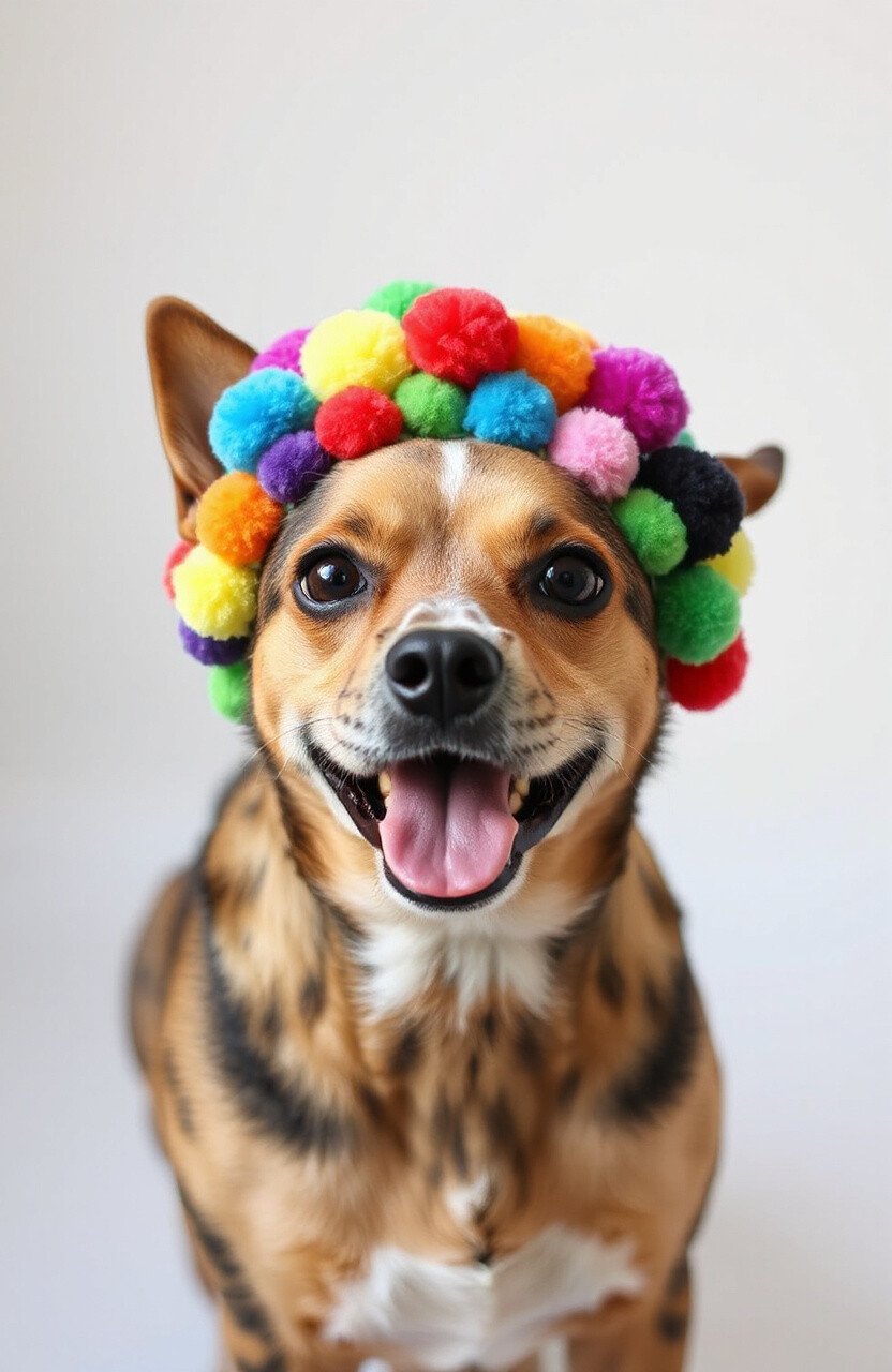 Bring the fiesta to your pet with a carnival pom-pom crown. Use colorful pom-poms for a festive and fun vibe.