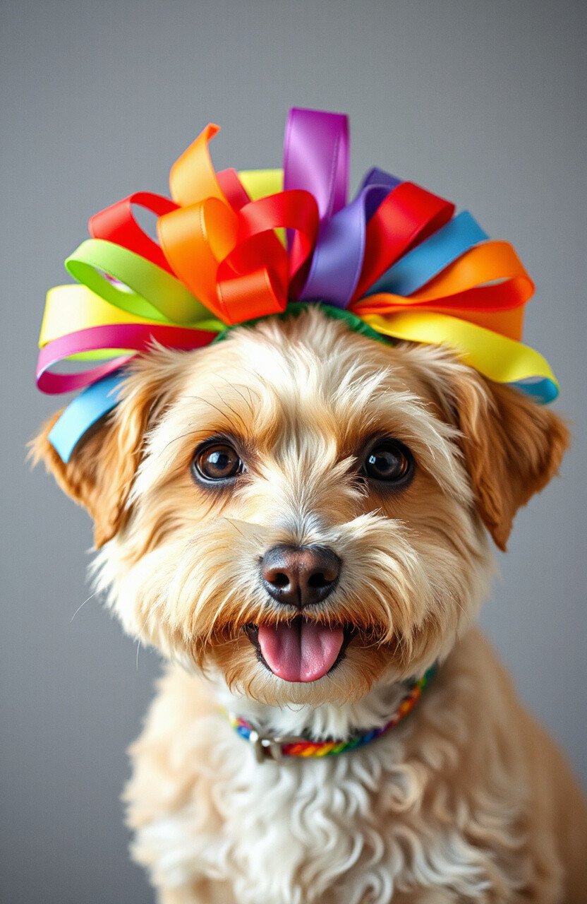 Brighten your pet’s day with a rainbow ribbon crown. Use ribbons in various colors to create a cheerful and vibrant accessory.