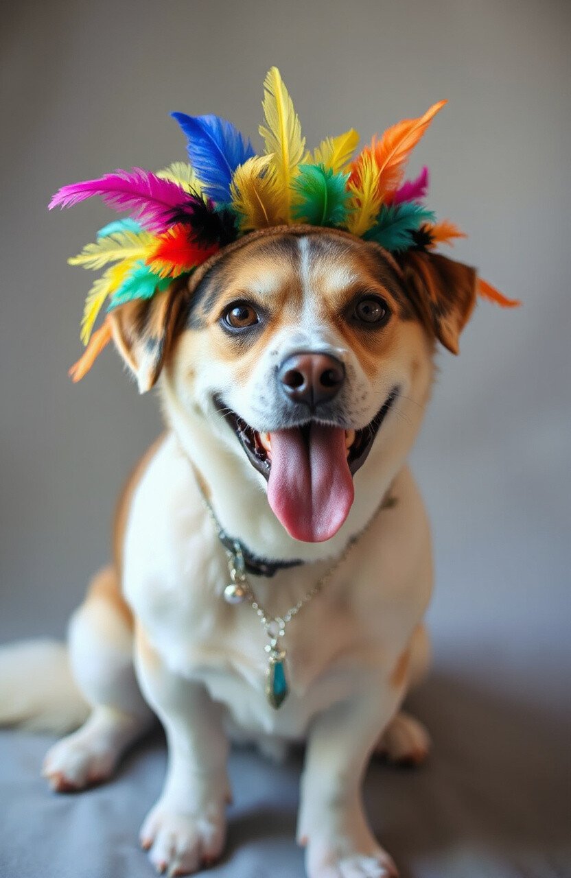 For a free-spirited pet, a bohemian feather crown is the perfect accessory. Use colorful feathers for a playful and lively look.