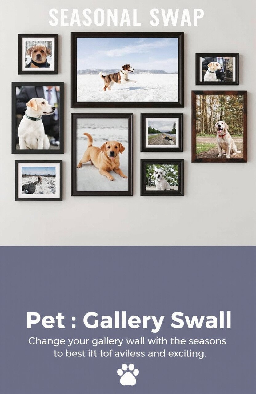 Change your gallery wall with the seasons to keep it fresh and exciting. Use photos of your pet playing in the snow for winter or lounging in the sun for summer.