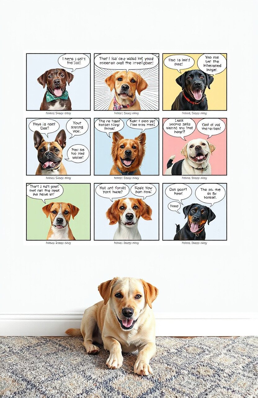 Turn your pet’s antics into a comic strip for a playful wall feature. Capture funny moments and add speech bubbles for extra fun.
