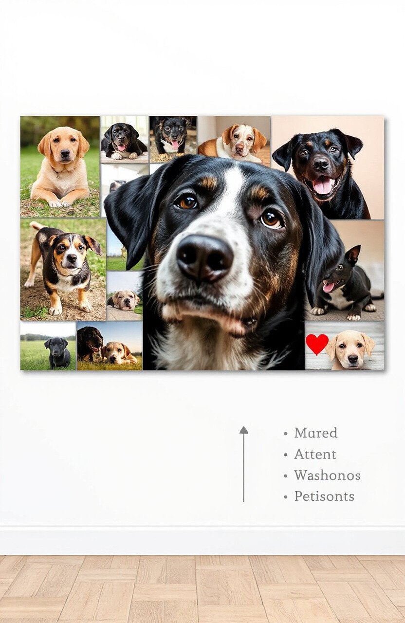 A collage of pet memories is a heartwarming way to showcase your pet’s journey. Use multiple photos to create a story on your wall. This is a great option for pet lovers with lots of photos to display.
