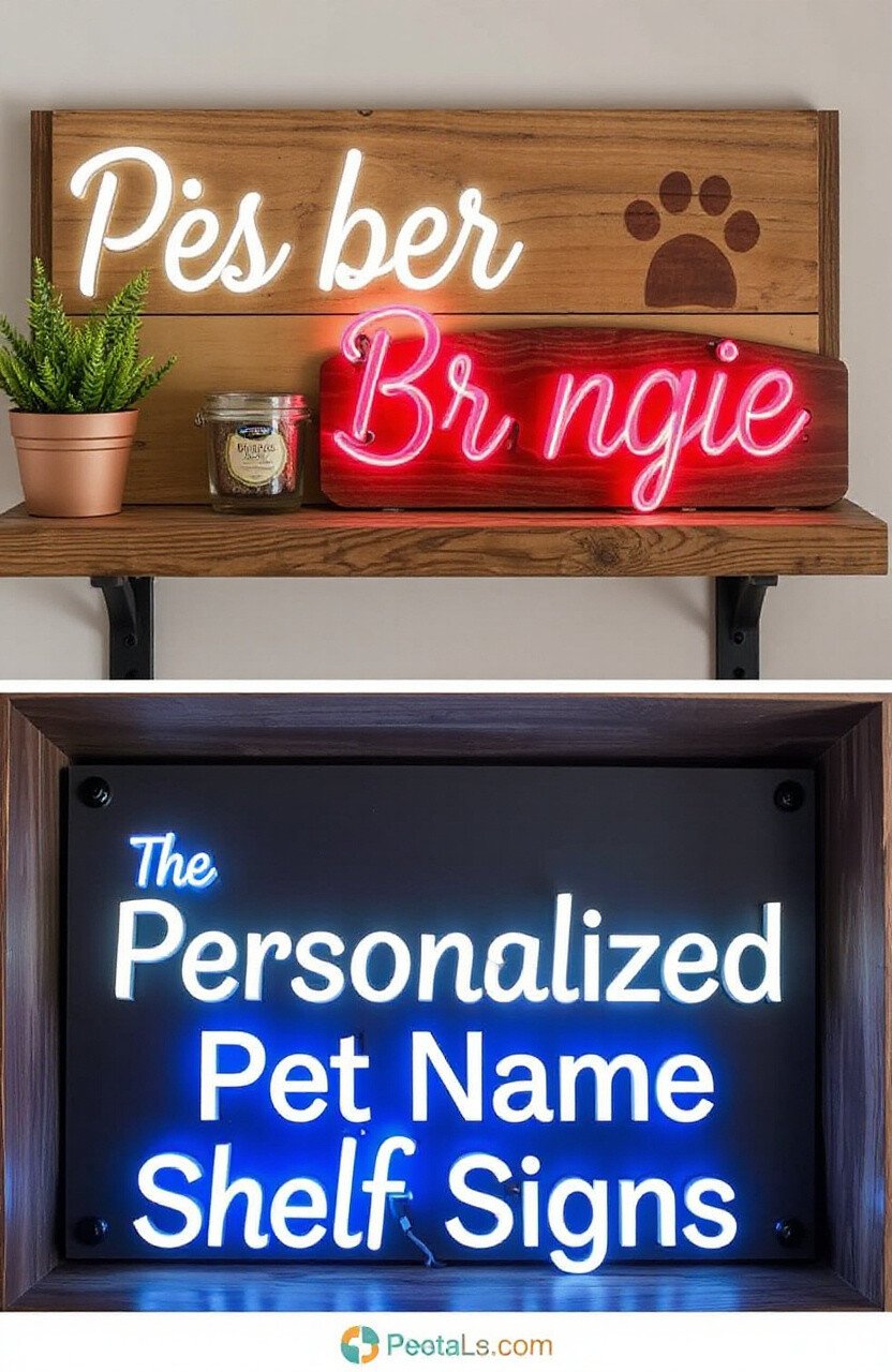 Have you ever thought of displaying your pet’s name in a creative way? Personalized name signs add a special touch to your shelf. You can choose from wood, metal, or even neon signs.