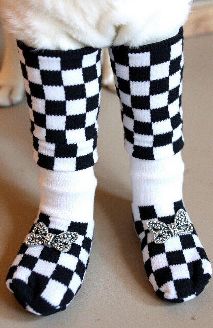 Checkerboard Charm socks bring a retro vibe to your pet’s outfit. The black and white pattern is both bold and stylish.
