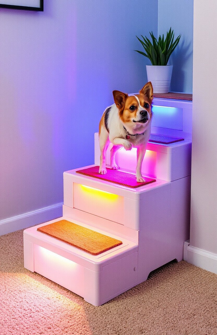LED lights add a futuristic touch to these stairs. Perfect for tech-savvy pet owners who love a bit of flair.