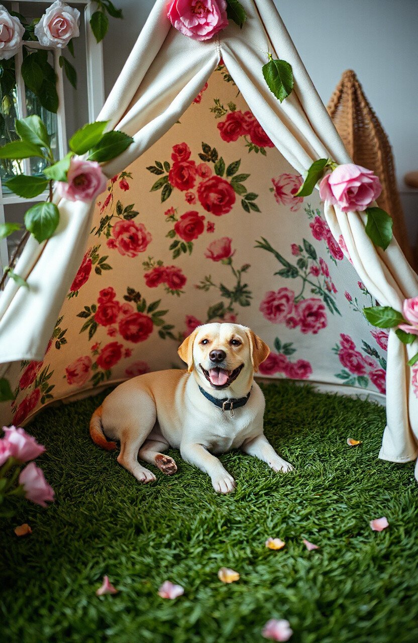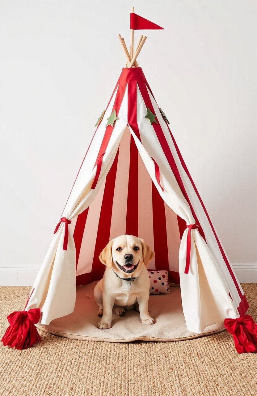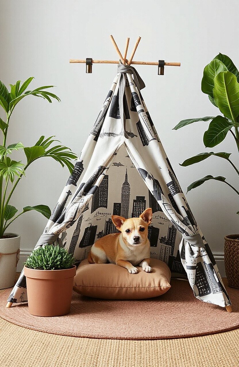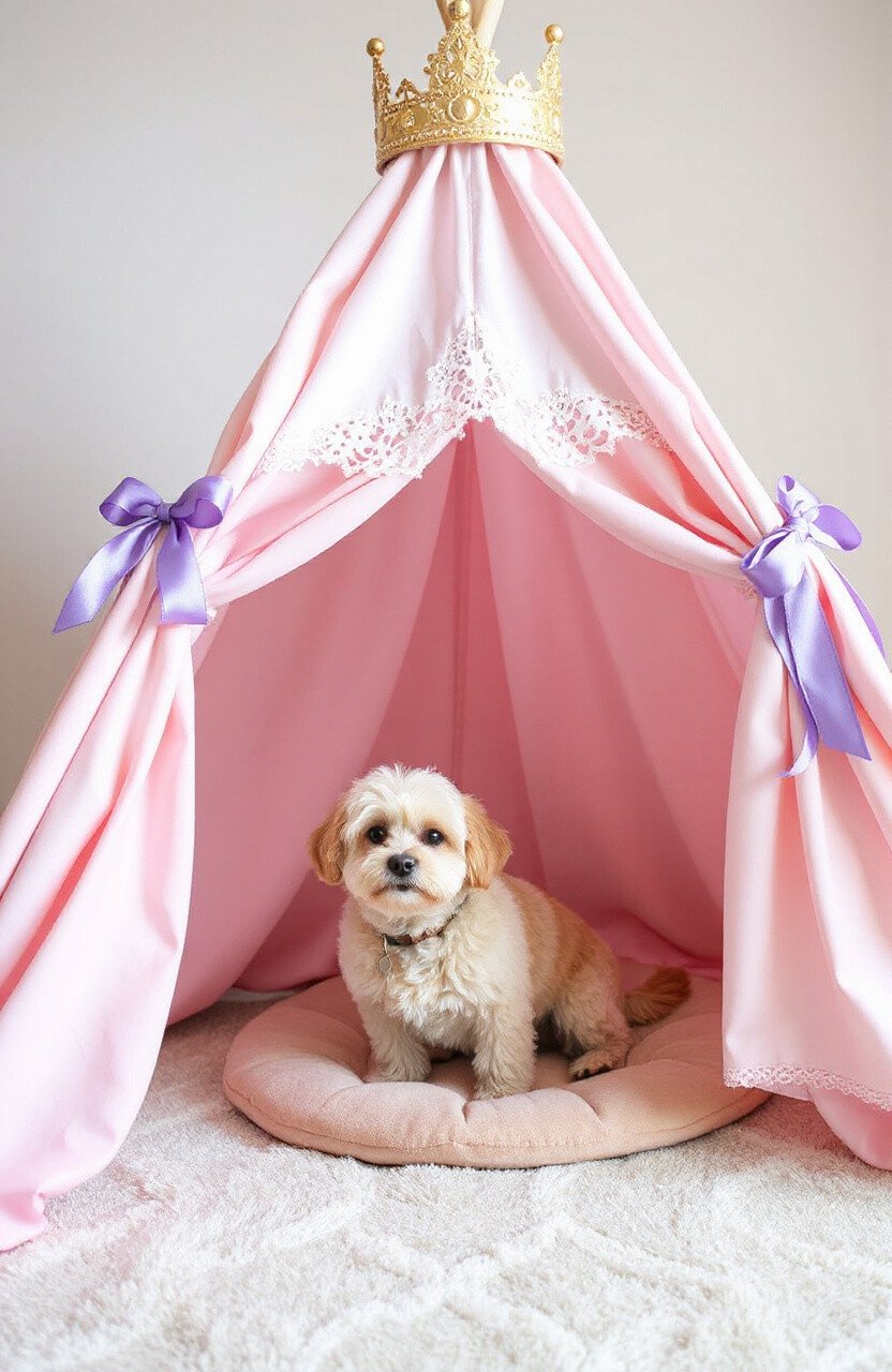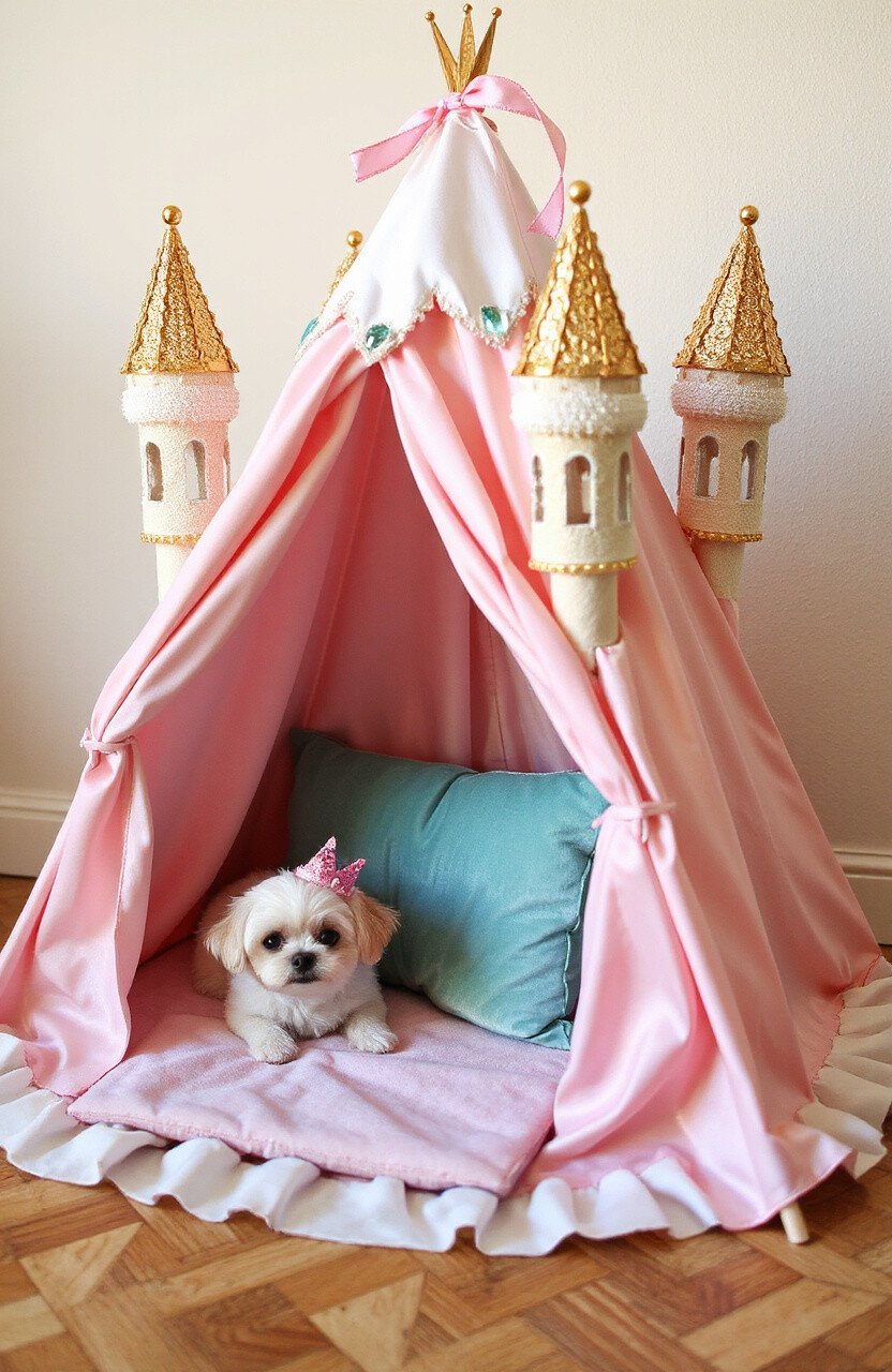 Turn your pet into royalty with a fairy tale castle teepee. Use shimmering fabrics like satin or tulle. Add tiny turrets and decorative jewels for a regal touch.