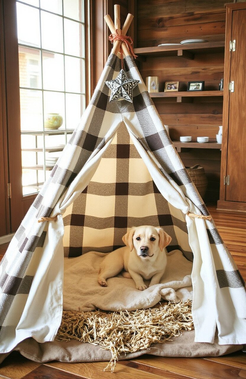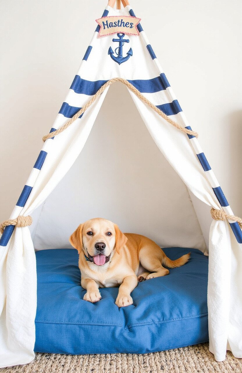 Set sail on a seaside adventure with a nautical-themed teepee. Think navy stripes, rope accents, and anchor motifs. This style brings a fresh, breezy feel to your pet’s space.