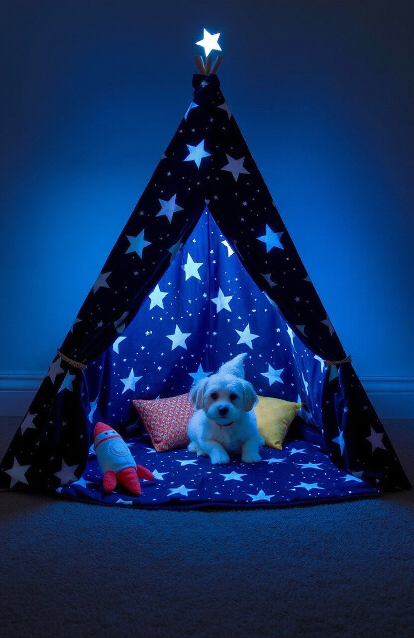 Blast off to space with a galactic star teepee. Use dark fabrics with star patterns or glow-in-the-dark elements. Add a few space-themed toys or pillows.