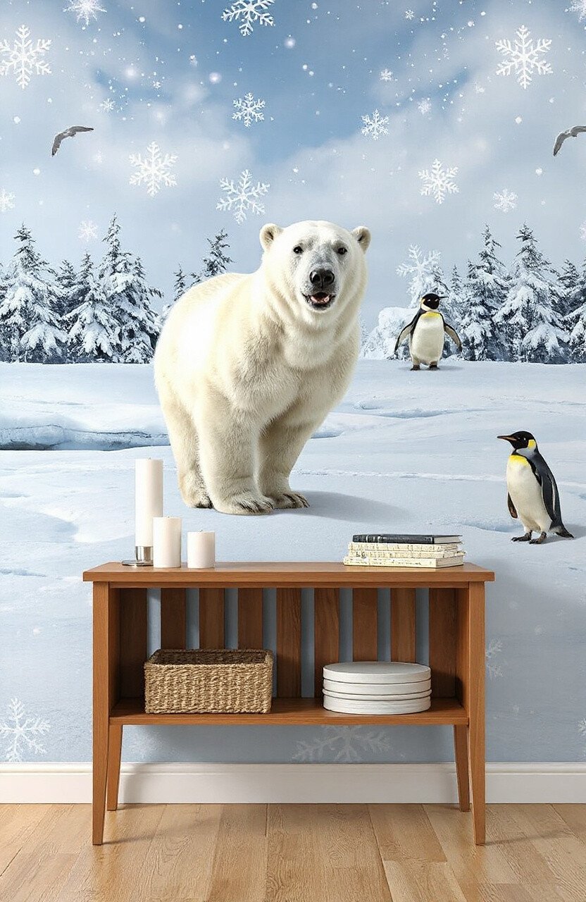 Embrace the beauty of winter with wallpaper featuring snowy landscapes and winter animals like polar bears and penguins. It’s like having a winter wonderland in your home!