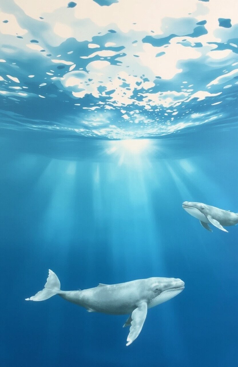 Explore the majestic world of whales with wallpaper featuring these gentle giants of the sea. Picture whales swimming gracefully through a deep blue ocean.