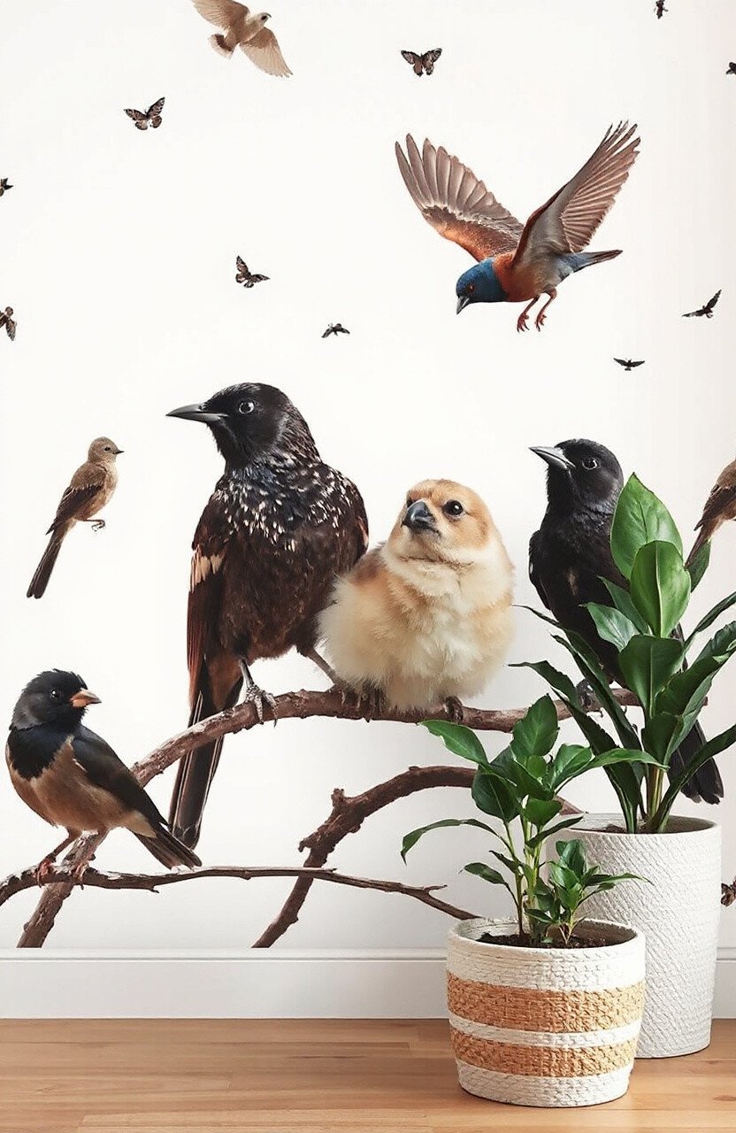Complement the wallpaper with bird-themed decor and natural materials. Adding a few potted plants can enhance the serene vibe.