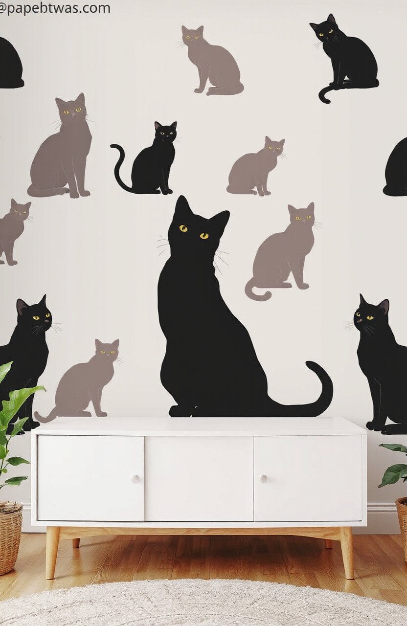 Bring the grace of cats into your home with a wallpaper featuring elegant felines. Think of sleek silhouettes of cats in various poses against a soft background. It’s like having a gallery of cat art on your walls!