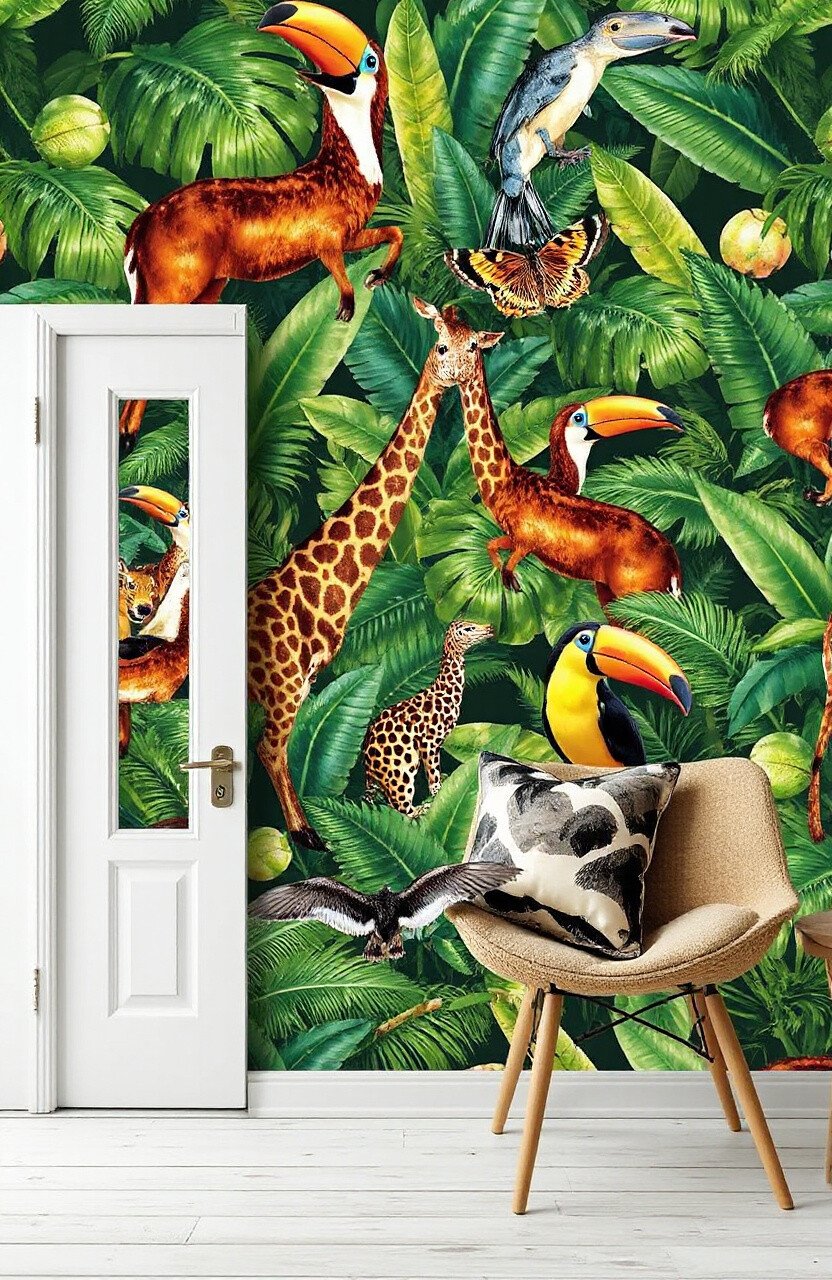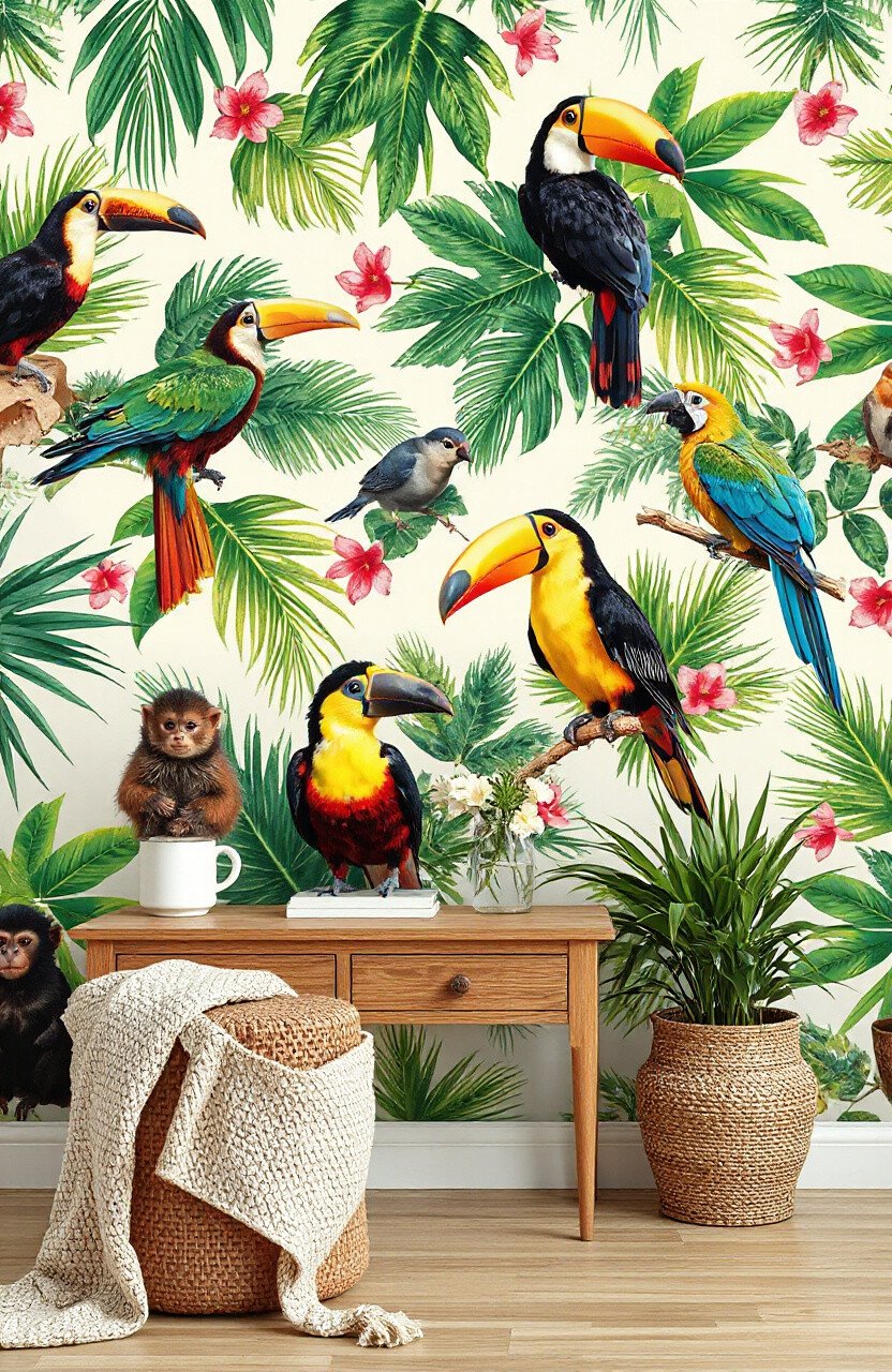 Escape to a tropical paradise with wallpaper featuring exotic animals like toucans, monkeys, and parrots. It’s like stepping into a vibrant jungle every time you enter the room.