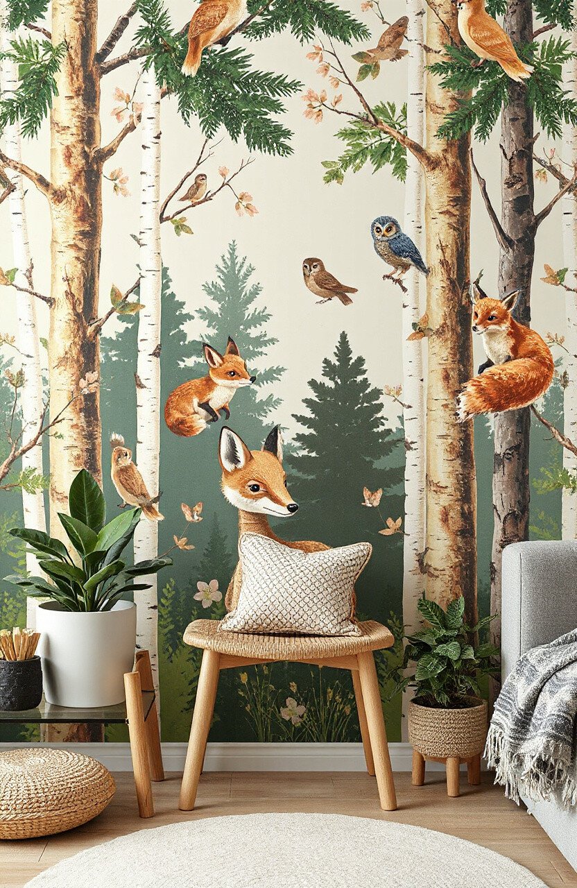 Transform your space into an enchanting forest with woodland animal wallpaper. Imagine foxes, deer, and owls peeking through the trees. It’s a magical scene that brings the beauty of nature indoors.