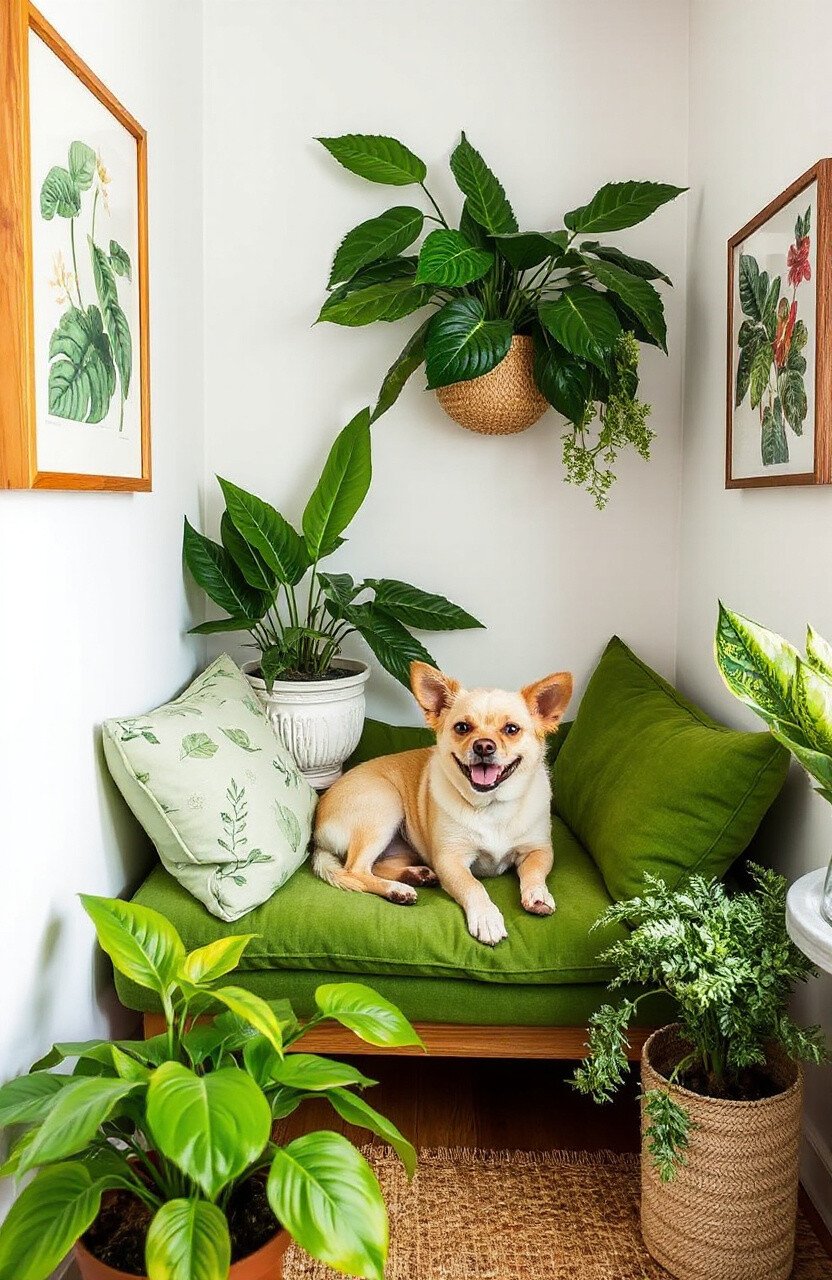 Turn your pet’s nook into a lush garden retreat with botanical prints, green cushions, and floral arrangements. A small indoor plant can add a burst of freshness.