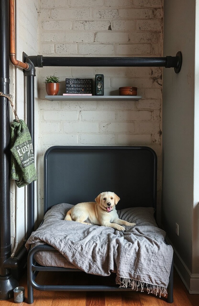 Give your pet nook an industrial touch with metal details, exposed pipes, and concrete elements. A steel-framed bed can add an edgy vibe.