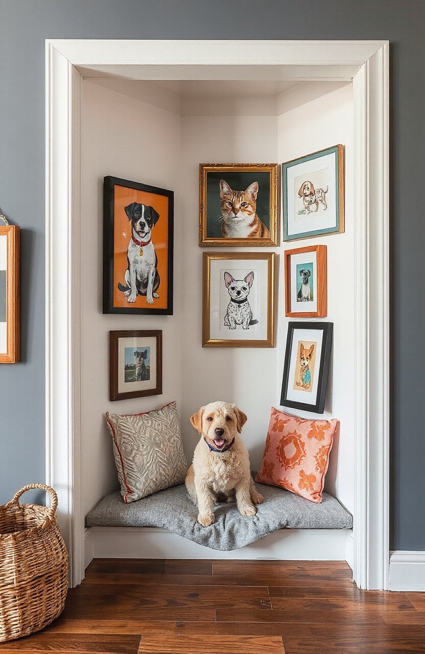 Channel your artistic side with a pet nook that doubles as a mini gallery. Display pet-themed artwork, colorful prints, and creative designs.