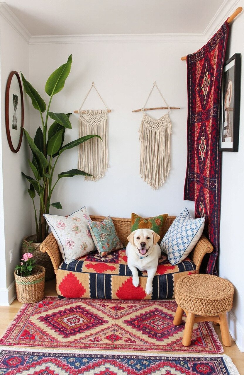 Give your pet nook a bohemian vibe with colorful textiles and eclectic decor. Use patterned rugs, macramé wall hangings, and a mix of pillows to create a layered look.